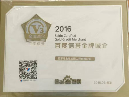 2016年6月,百度權威認證機構委派專員來公司考察,針對經營場所、資本及財務能力、生產及研發能力、運營能力、產品及品牌能力、信息系統管理能力、質量管理能力、售后服務能力等十八項進行核驗。正式通過百度誠企認證企業,被百度推薦為百度誠企專區金牌商戶,授予V3信譽等級,獲得了百度的認可與強勢推薦企業。百度這標志著金億加固公司在誠信檔案中又多了濃墨重彩的一筆,在建筑加固行業中一枝獨秀,繼續保持強勁的發展勢頭。